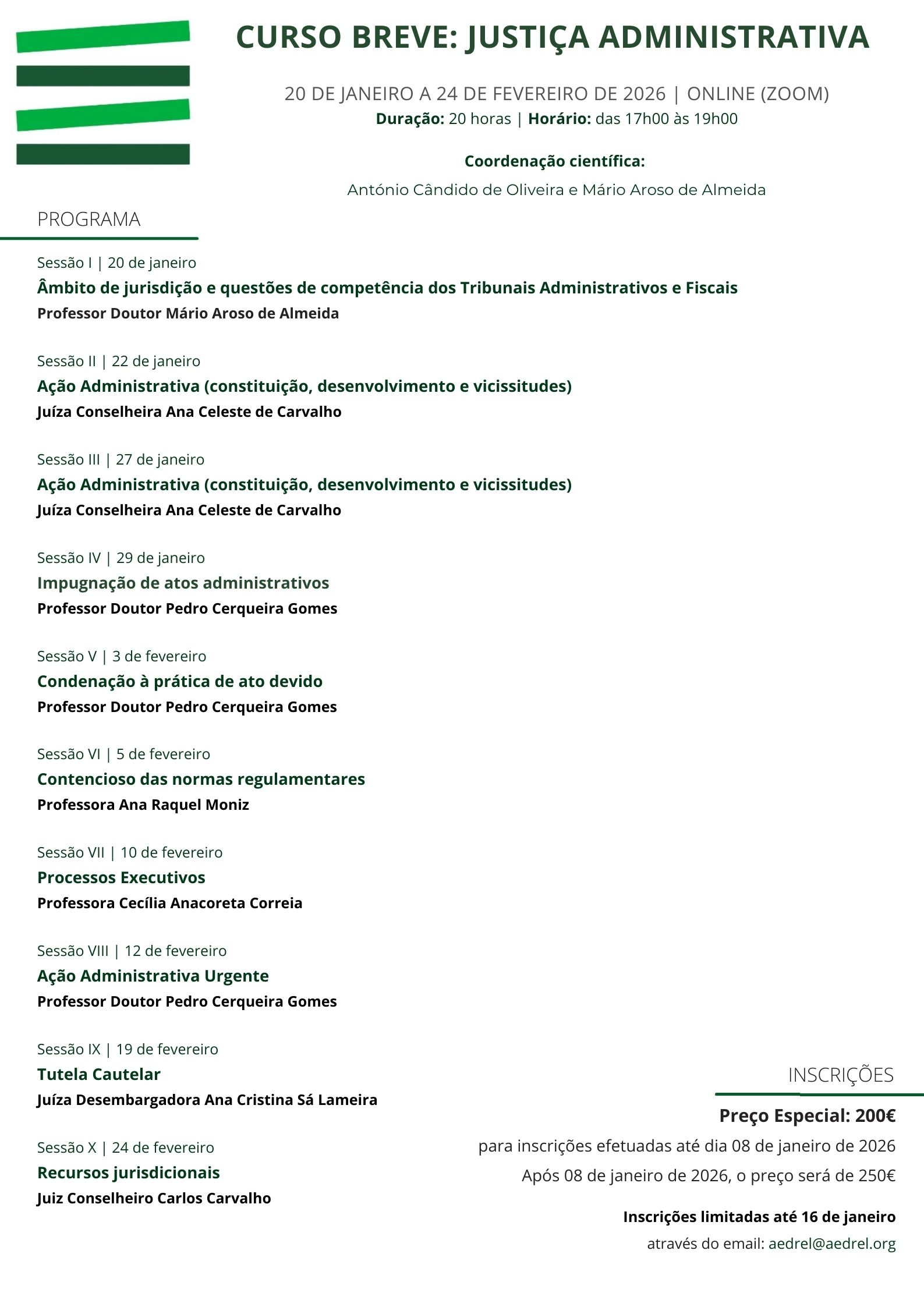 A AEDREL vai organizar um Curso Breve de Justiça Administrativa, que se reveste da maior importância.